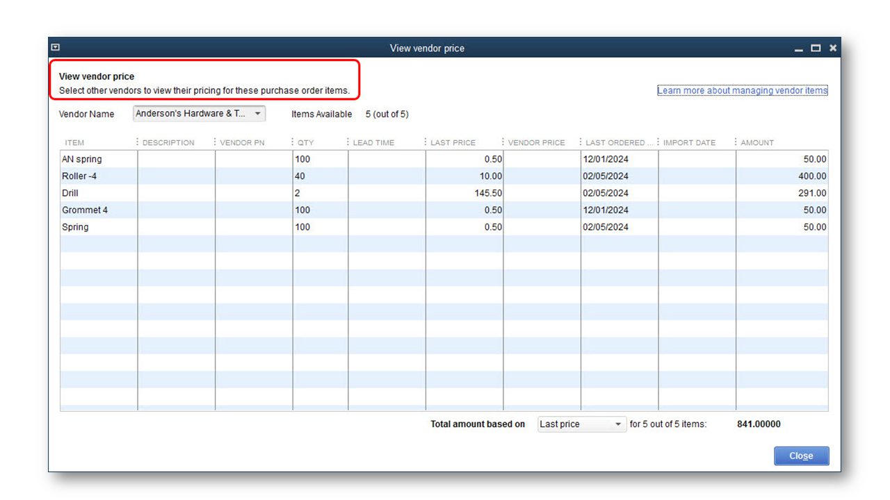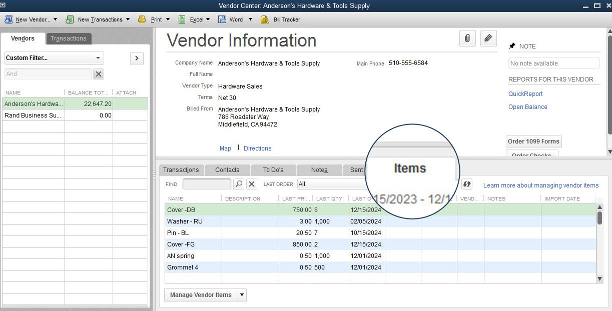 Accessible: From the menu bar, select Vendor Center and click the Items tab