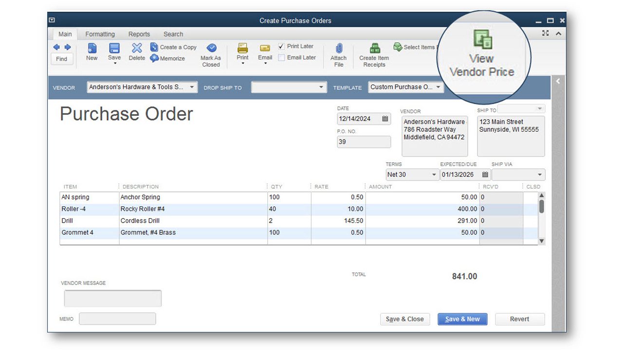 create purchase orders with vendor information automatically included.