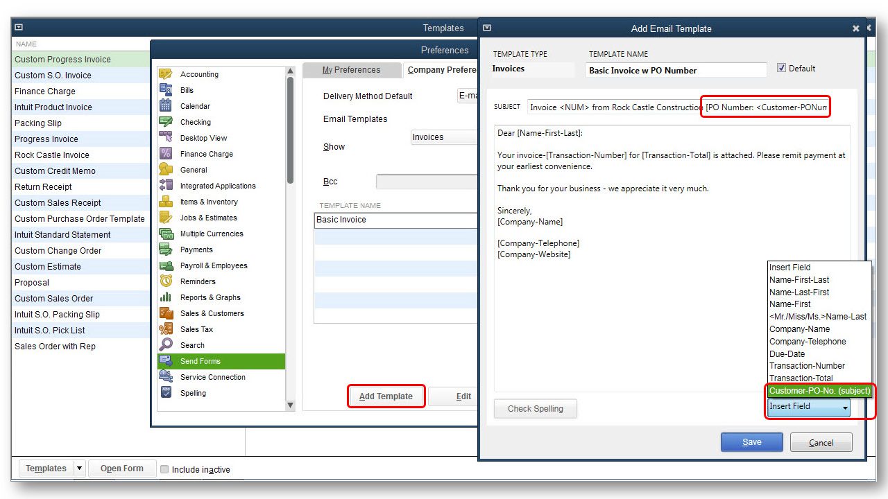 Accessible: From the menu bar, select Edit > Preferences > Send Forms > Company Preferences. Select the appropriate template and click Edit, from the Insert Field button, select Customer-PO (subject)