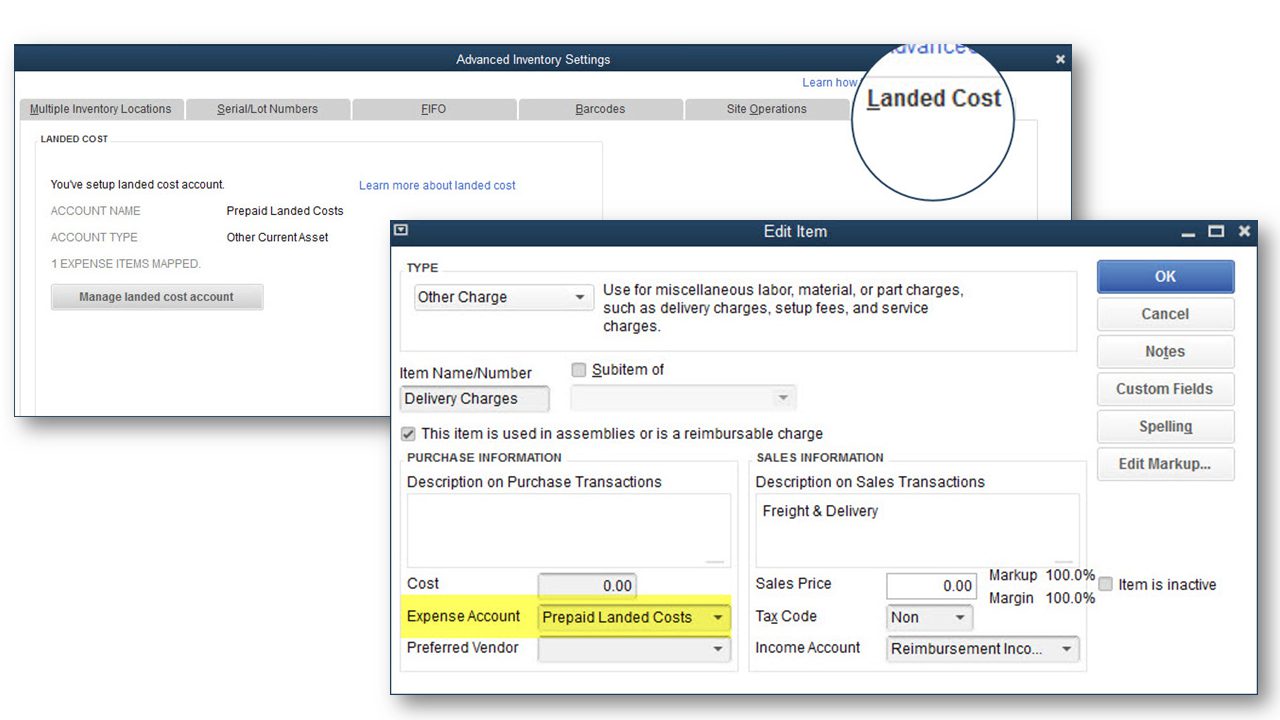 Landed Cost work-flow summary: #1: Enterprise user will need to setup Landed Costs in Advanced Inventory preferences. This process creates an Other Current Asset account. The Enterprise user then selects any Other Charge item types currently used to record freight, duties or import fees and the setup automatically changes the currently assigned expense account in the item record defaults to this newly created Other Current Asset account.