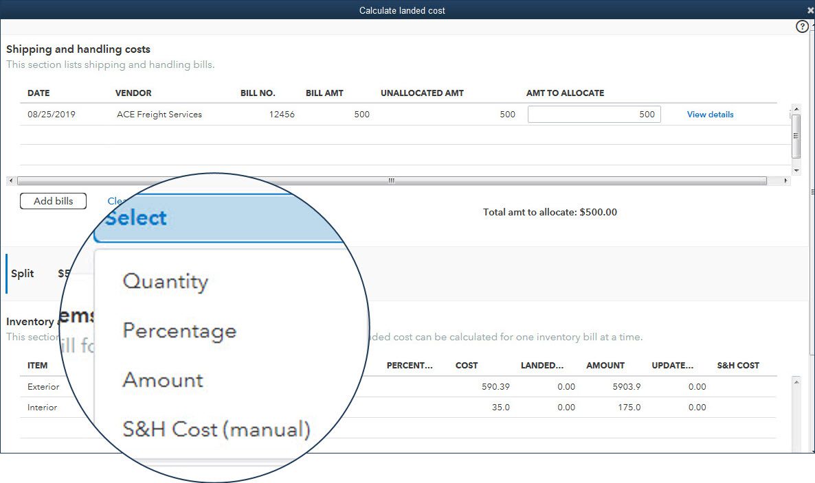 #3: Enterprise users select which freight bills to allocate to the product costs and how to calculate the amount allocated, choices include: Quantity, Percentage, Amount or S&H Cost (manual).